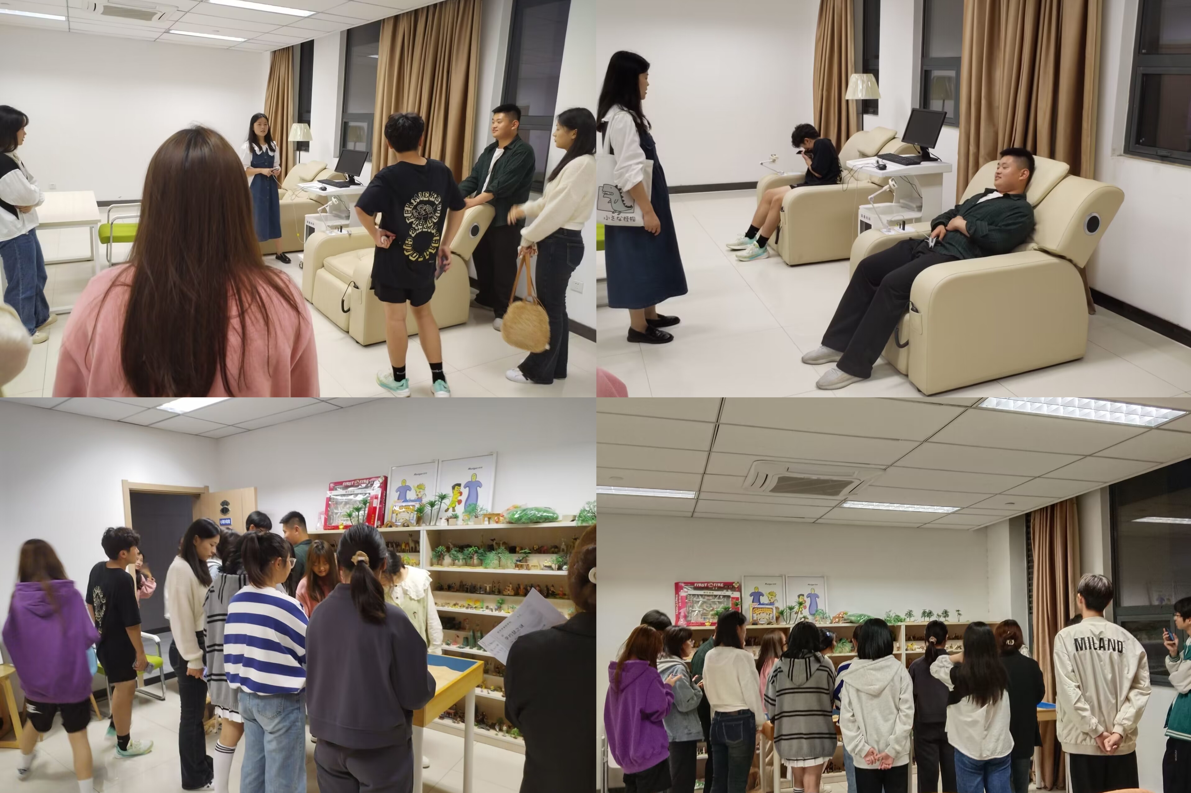 培训活动结束后,周燕老师带领大家前往校心理健康教育指导中心,分别参观了校个体咨询室、放松室、宣泄室和沙盘室等功能室,她希望通过心理委员以点带面让更多的同学更加了解校心理健康教育指导中心,能够主动前来寻求心理帮助。