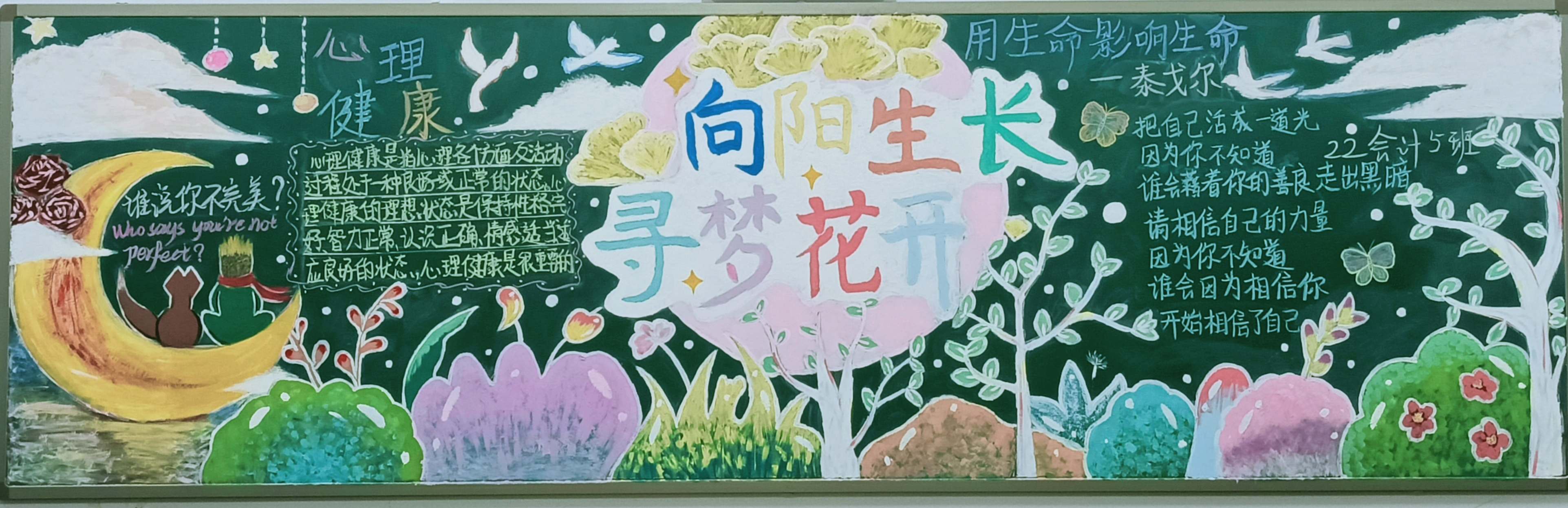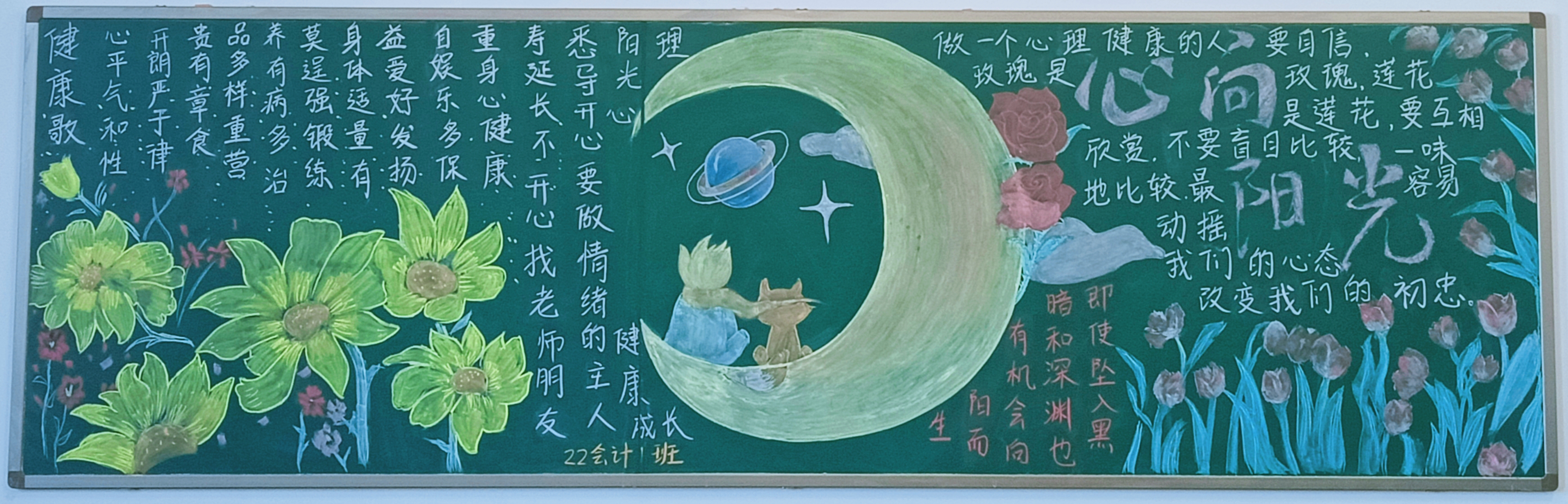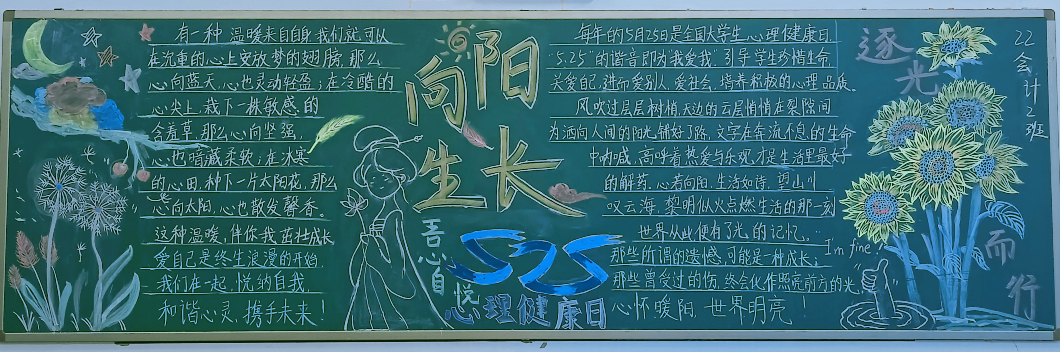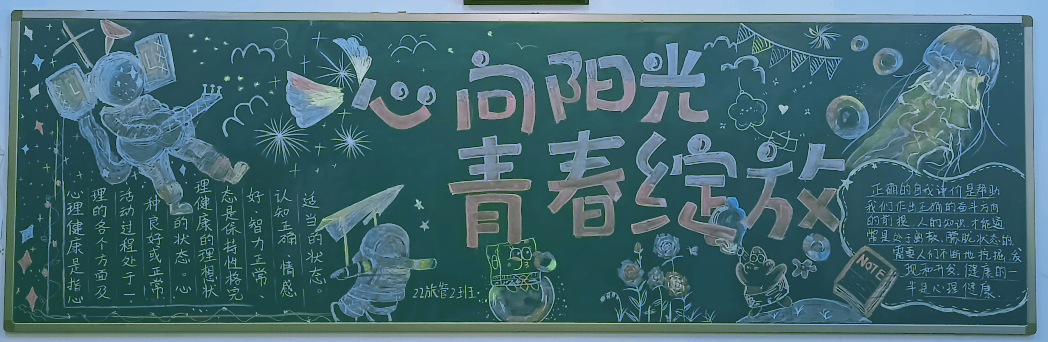 为了更好地宣传普及心理健康知识,让学生树立正确的心理健康观念,努力提高学生心理自我调节能力。5月15日至28日,永利集团304am登录在2022级各班级开展了“心向阳光,青春绽放”为主题的心理健康教育主题黑板报评比活动。