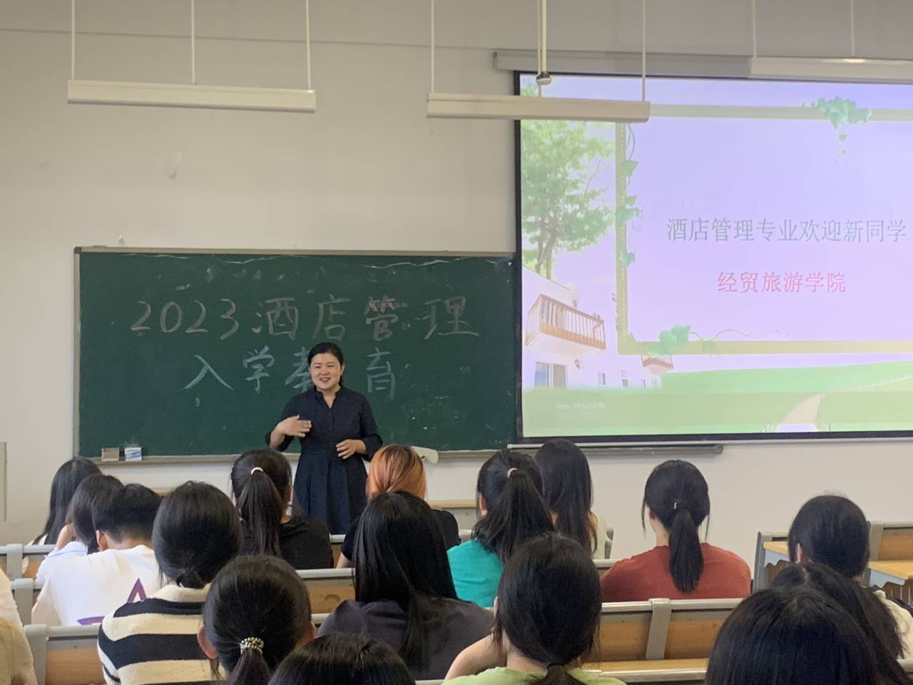 旅游管理教研室杨洋老师在汇心湖校区南教学楼414教室组织开展了名为“脚踏实地,筑梦远航”的2023级酒店管理与数字化运营专业新生入学思想教育。杨洋老师对同学们成为合职大家庭中的一员表示热烈欢迎,并通过PPT展示,分别从专业介绍、课程体系、教学条件、就业前景、成长规划五个方面向同学们做了详细的阐述。重点强调了新专业人才培养目标下同学们要明确未来三年的学习目标,通过分享专业技能大赛、专升本与自学考试、专业资格证书考试等相关图片,鼓励新生向优秀老生看齐,做好个人近期、中期、远期目标规划。杨洋老师希望同学们尽快进入学习状态,以青春岁月换得良好的品德、丰富的知识,结交良师益友并拥有健康的体魄。最后,她引用美国精神教父爱默生的一句话说:“一心向着自己目标前进的人,整个世界都会为你让路。