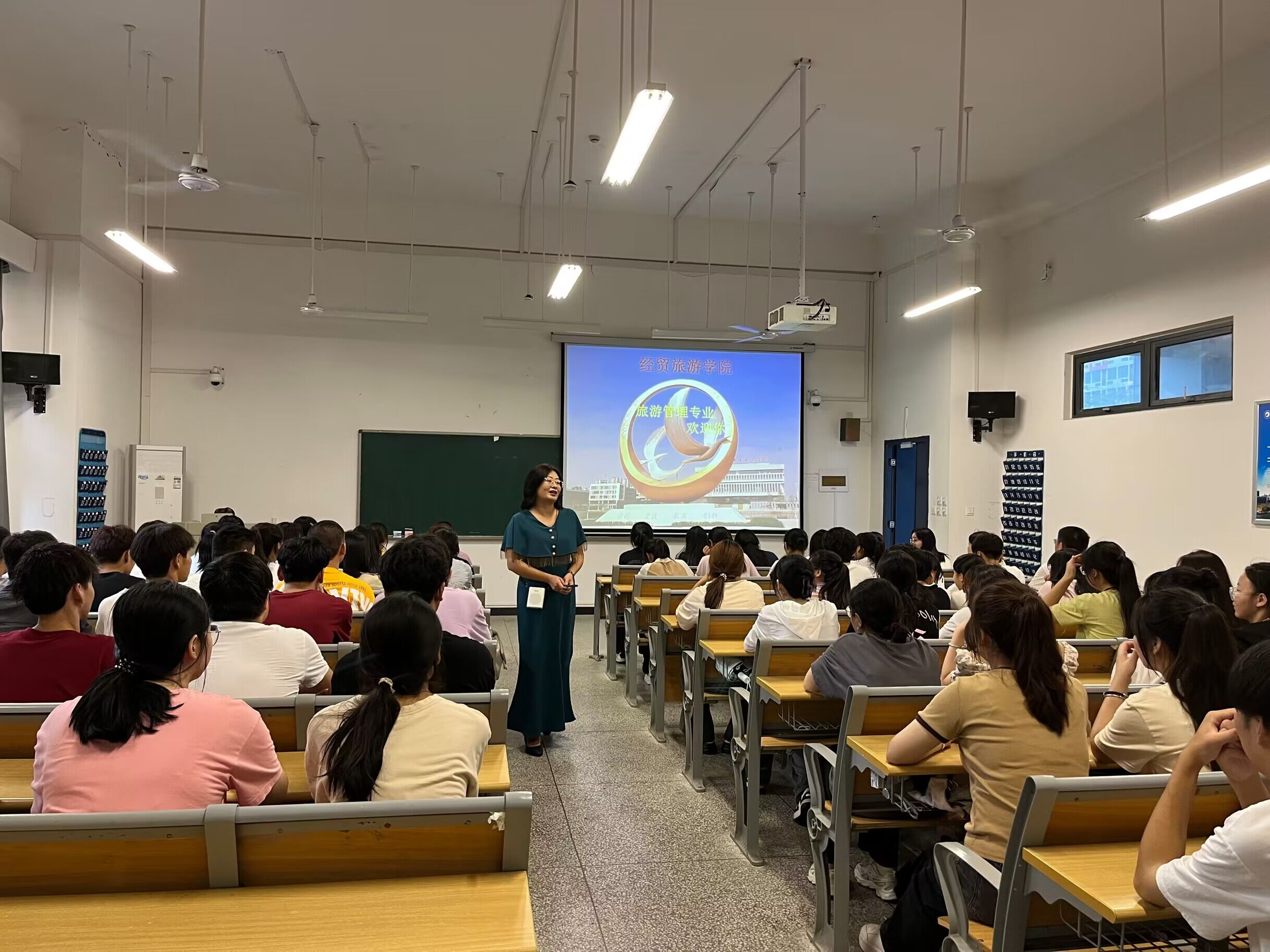 旅游管理教研室姚启芳付教授在汇心湖校区南教学楼108教室为23级旅游管理专业新生作了《旅途万里伴你行,游迹千载系深情》的入学思想教育。姚老师分别从师资队伍、校内外实训基地、职业技能竞赛、学生风采、专升本情况等方面对专业情况进行详细介绍,其热情而充满亲和力的讲授,感染了在座的每一位同学,增强了同学们的自信心及对专业的无限憧憬和向往。整个过程,在场同学都听得津津有味。最后姚老师帮助同学们进行了大学学习规划的制定,明确目标,砥砺前行,并预祝同学们大学期间成绩优异,成果丰硕。