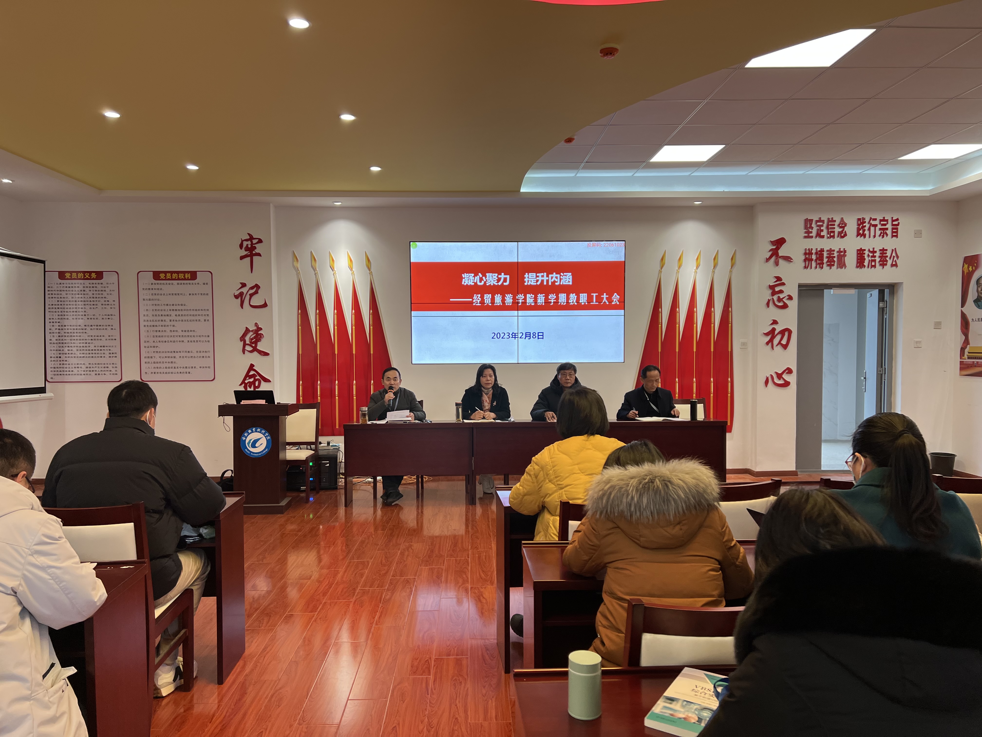 赵红院长传达了2023年学校工作务虚会精神、校党委书记王杰才同志的主要讲话精神并作总结报告。她指出,2022年,在全院教职工的共同努力下,学院在党建和发展工作方面“稳中有进”,成绩显著。新学年,新气象,我们更应满怀信心,齐心协力,克服困难,紧紧围绕学校“聚焦高质量”发展主题,改进作风提状态、提高标杆定目标,坚持问题导向补短板,凝心聚力、提升内涵,争取实现学院工作更大发展,为学校“双高”计划申报、争创职教本科添砖加瓦!