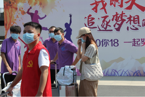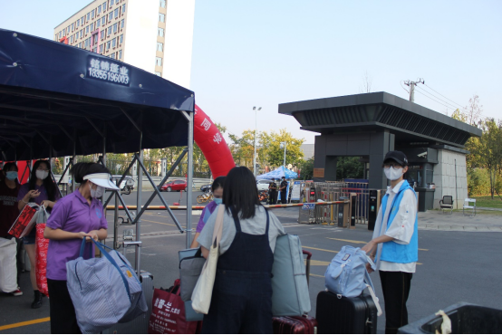 志愿者们帮助他们提着行李、推着箱子成为校园一道美丽风景。