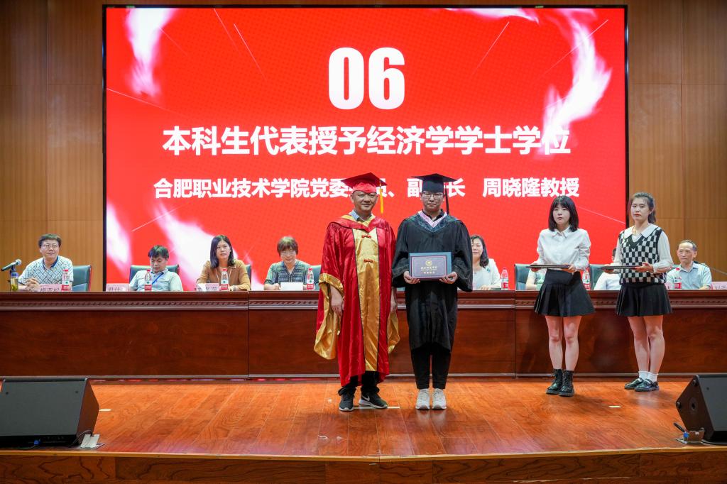 永利集团304am登录副校长周晓隆教授宣读2022届经济与金融专业毕业生学位授予决定,11位毕业生代表有序走上前台,周校长与他们握手,为他们拨正流苏,颁发毕业证书、学士学位证书。