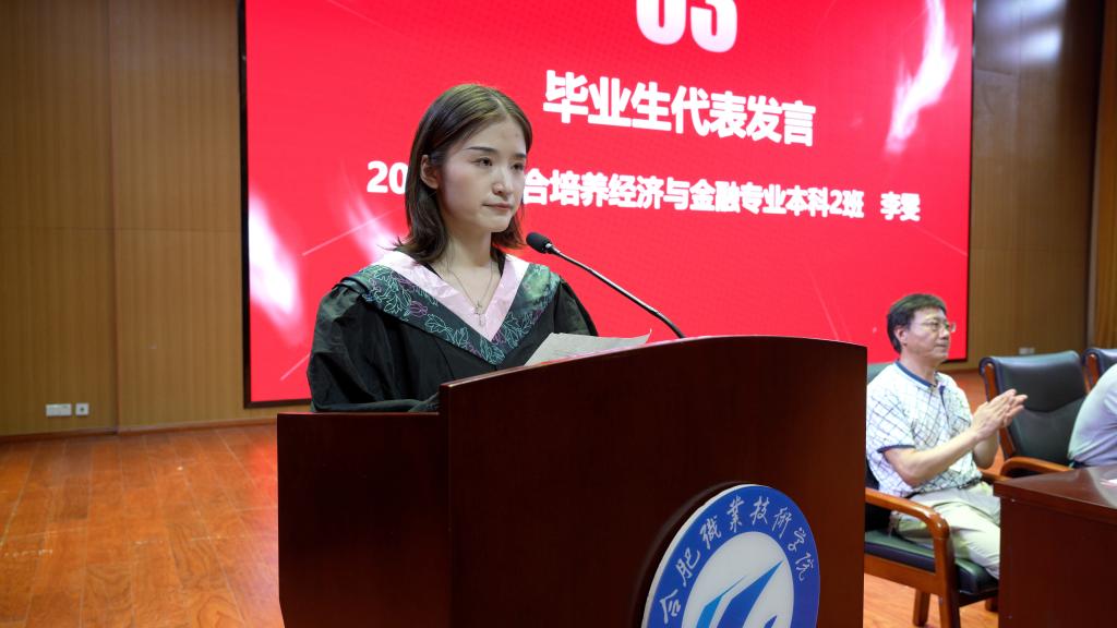 2020级经济与金融2班李雯同学代表毕业生发言。发言中,她感恩母校的悉心栽培和老师的谆谆教诲,感谢同学们的互相帮助和扶持鼓励。她以勇敢面对未来,不忘教诲,勇于挑战与全体毕业生互勉。同学们在现场同唱歌曲《再见》,再见,同学们!再见,母校!