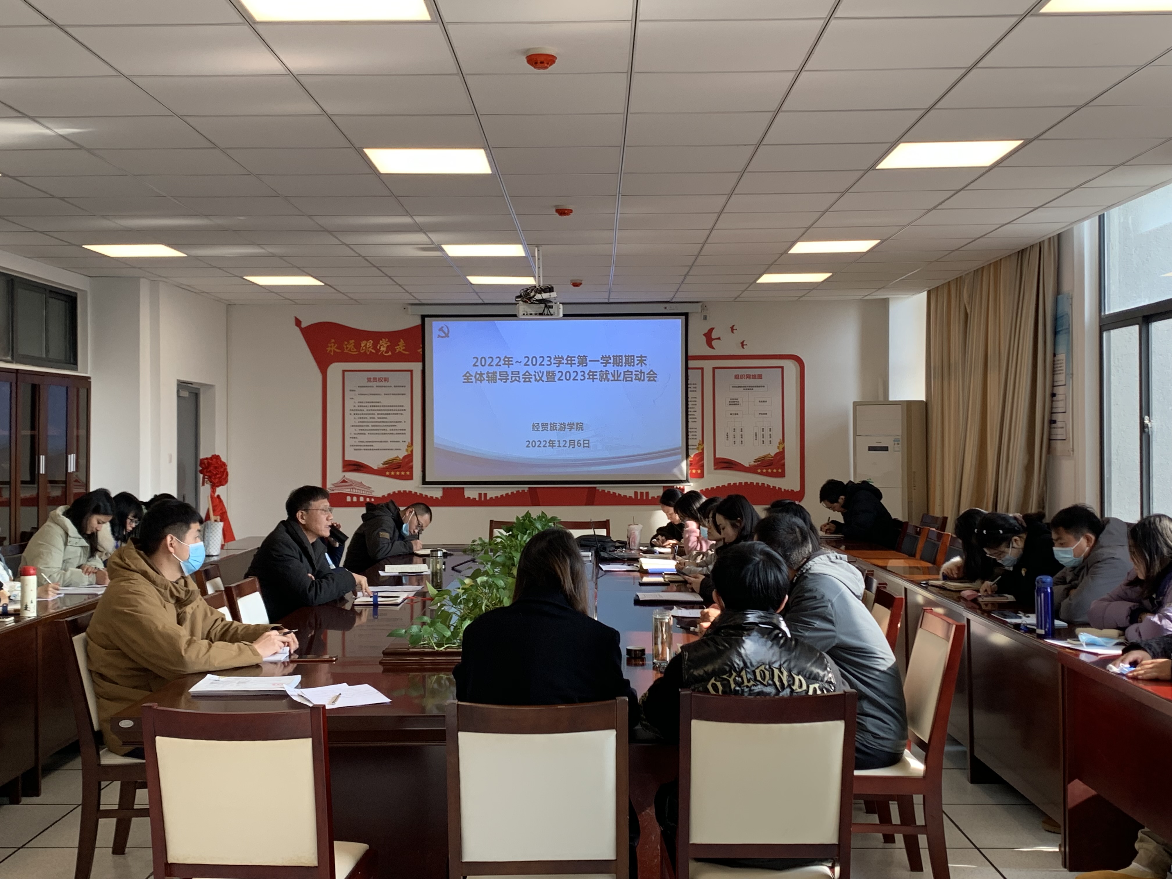 12月6日中午,永利集团304am登录在会议室召开2022-2023学年第一学期期末全体辅导员会议暨学院2023年就业工作启动会。学院党总支书记梅亚松、党总支副书记刘圣春及全体专兼职辅导员参加了会议。