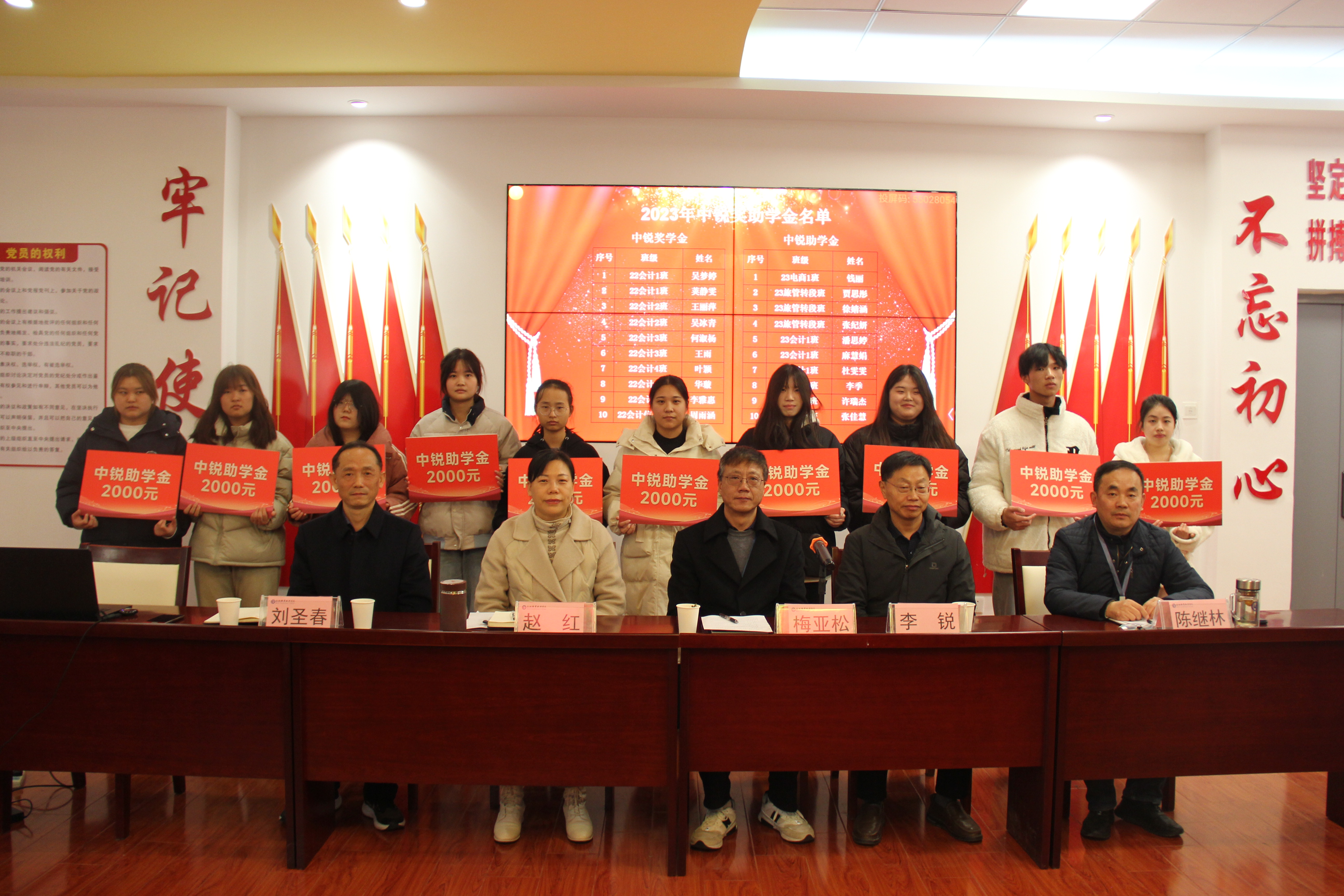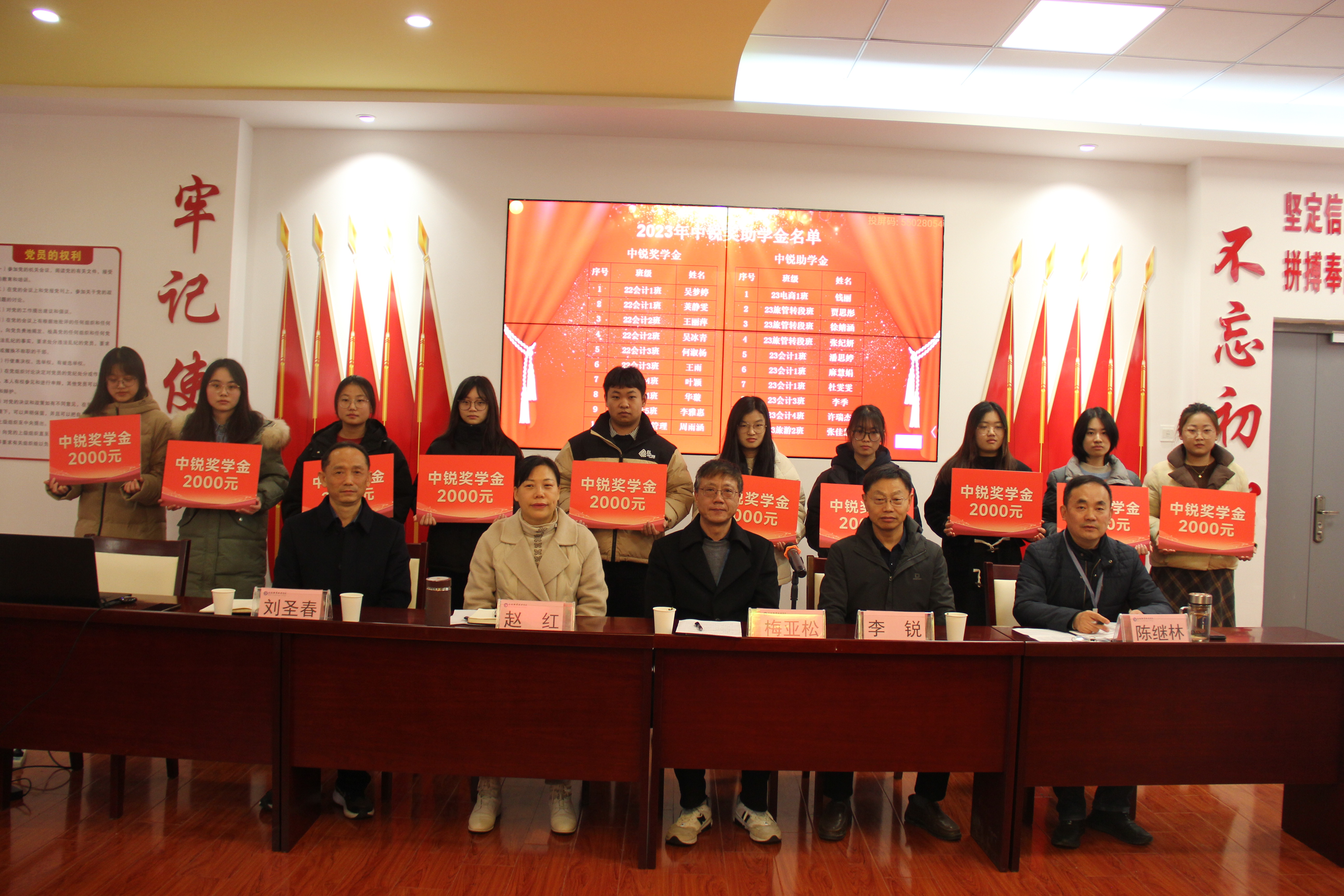 12月12日下午,永利集团304am登录在学院三楼党性体验馆举行2023年“中锐”奖助学金颁奖仪式。安徽中锐税务师事务所有限责任公司董事长李锐、学院党政领导班子、学院学管办全体辅导员、全体获奖学生和部分学生代表参加了此次颁奖仪式。颁奖仪式由学院党总支书记梅亚松主持。