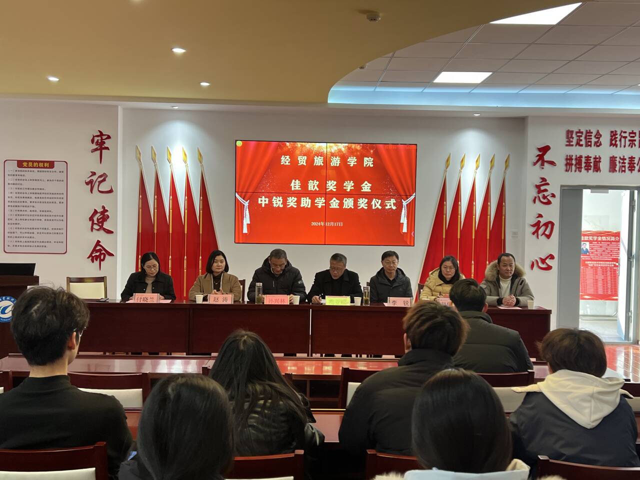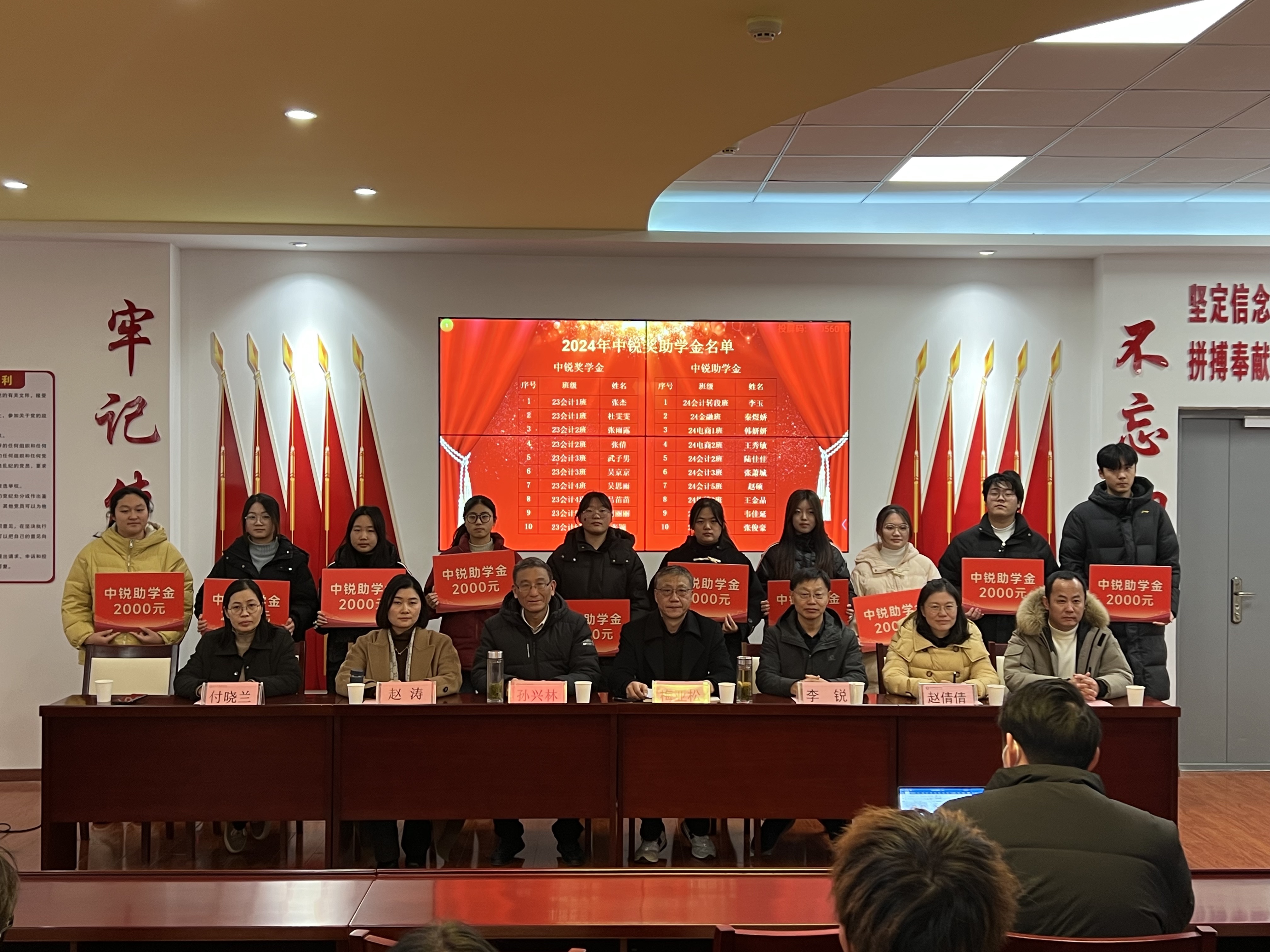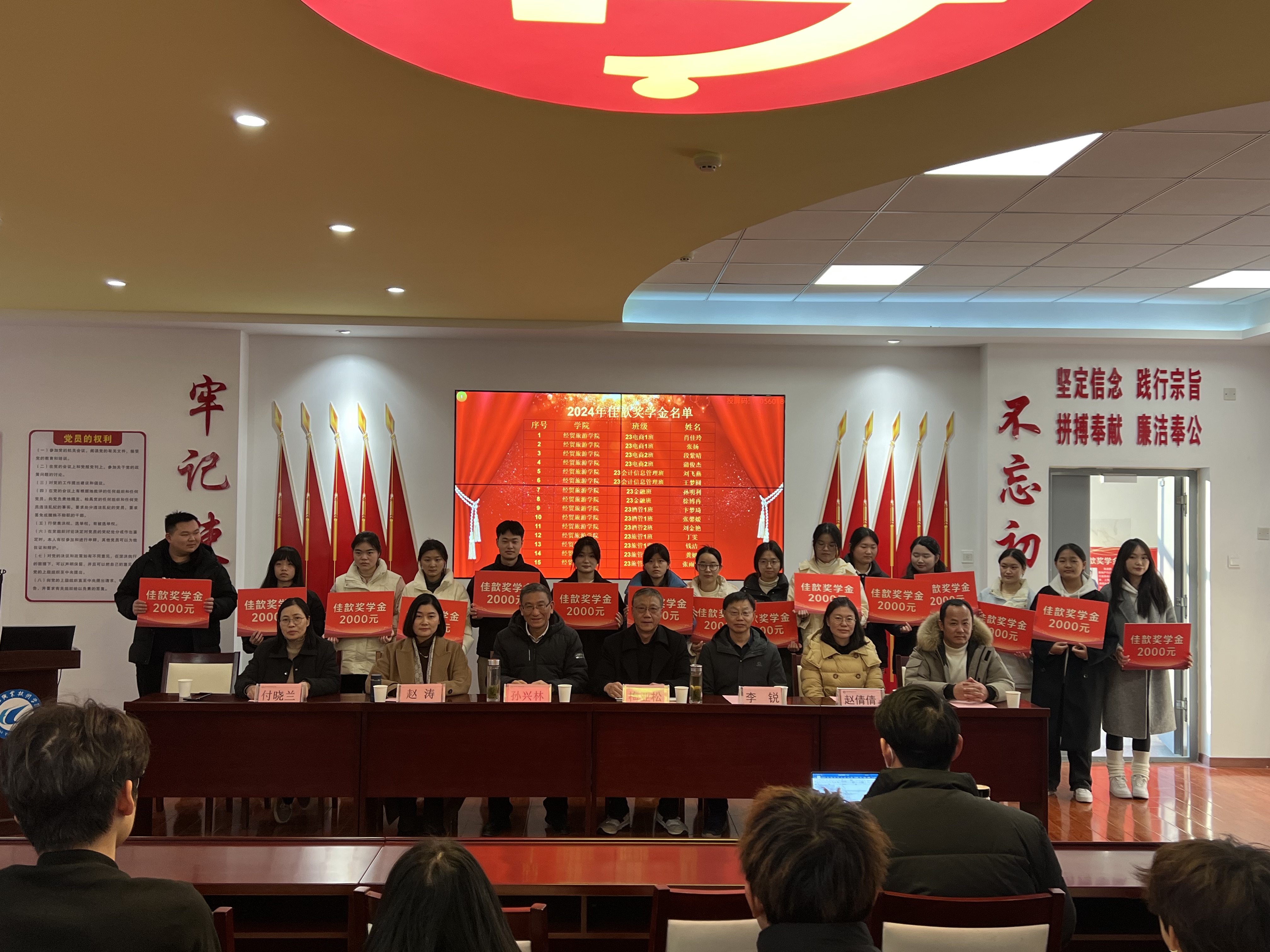 12月17日下午,永利集团304am登录在党性体验馆举行2024年佳歆奖学金、中锐奖助学金颁奖仪式。校关工委副主任孙兴林、安徽中锐税务师事务所有限责任公司董事长李锐、上海佳歆房地产投资顾问有限公司总经理赵涛、学院党政领导班子、学院学管办全体辅导员、全体获奖学生和部分学生代表参加了此次颁奖仪式。颁奖仪式由学院党总支书记梅亚松主持。